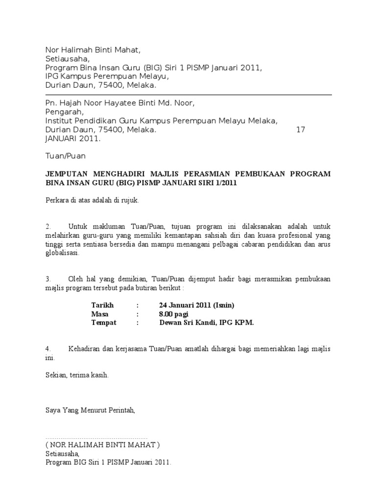 Surat peserta kursus pps01ukm. Contoh surat jemputan pengarah ke majlis rasmi institusi ipg. Pada akhir surat kiriman rasmi ini pengirim perlu melengkapkan tandatangan pada bahagian kiri surat.